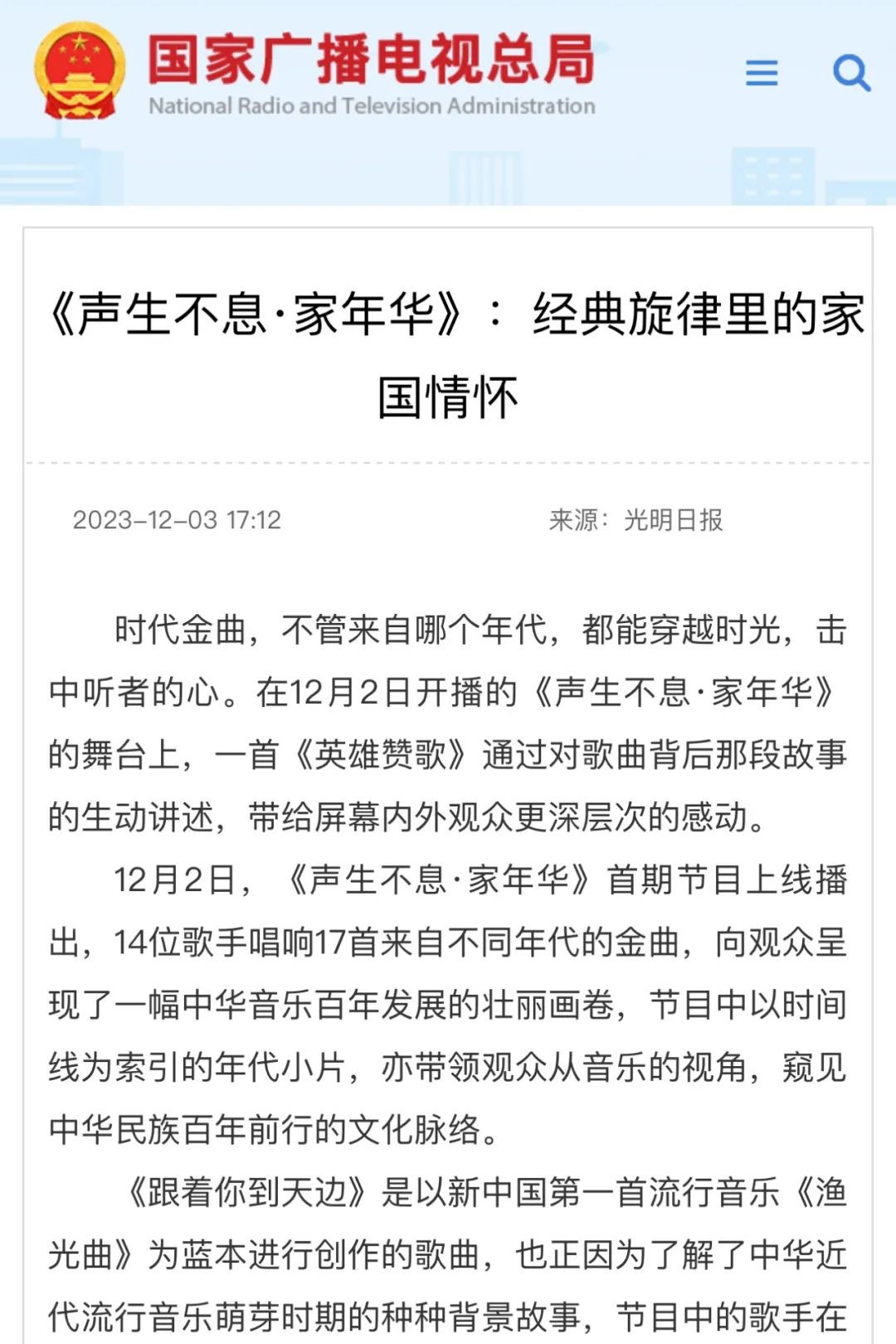 国家广播电视总局官网刊文:“《声生不息·家年华》带领观众从音乐的视角,窥见中华民族百年前行的文化脉络。以音乐为笔,注解家国情怀,记录国家前行的脚步。”人民日报发文:“节目开播引发观众热议,通过饱含深情的演绎肯节目对歌曲背后那段历史的生动叙述,为观众带来一场音乐盛宴。”新华网点赞《英雄赞歌》舞台,“声生不息以《英雄赞歌》致敬志愿军,这是他们用生命谱写的壮美乐章,这是一场山河永远铭记的伟大胜利!”新华社旗下瞭望周刊社点赞《唱支山歌给党听》:“道出了家国深情”。人民日报英文客户端发布《山河图》视频,表示“The melodious chant and rhythmical rap draw a magnificent view of China, which greatly shows the spirit of the country. ”(悠扬的咏唱和有节奏的说唱,勾勒出一幅波澜壮阔的中国画卷,极大地展示了中华民族的精神风貌。)