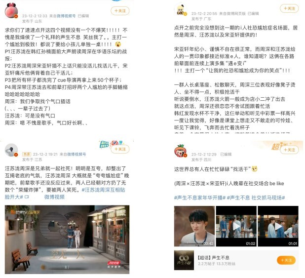在舞台之外,14位因音乐而结识的歌手的诸多相处名场面,也成为网友热议的焦点之一。#声生不息社交抓马现场#登陆热搜主榜,王心凌、汪苏泷、周深、时代少年团宋亚轩等嘉宾初相见时的状态,引发网友对于“i人社交”等社会话题的共鸣,并延伸出#汪苏泷周深宋亚轩汗流浃背了##陈楚生你回头看看汪苏泷吧##汪苏泷周深 是兄弟就一起社死#等话题讨论,网友纷纷表示:“简直演我过年回家见长辈”,“这世界总有人在忙忙碌碌‘找活干’”。